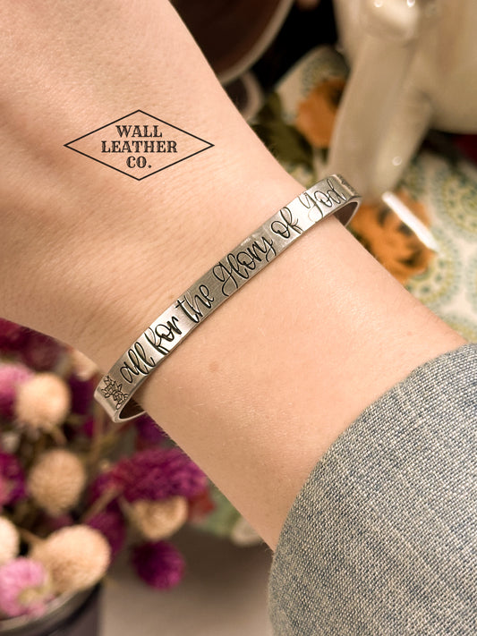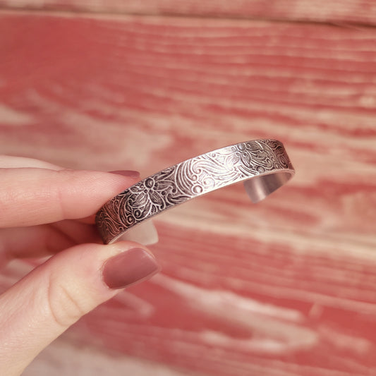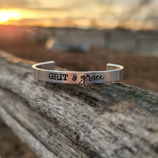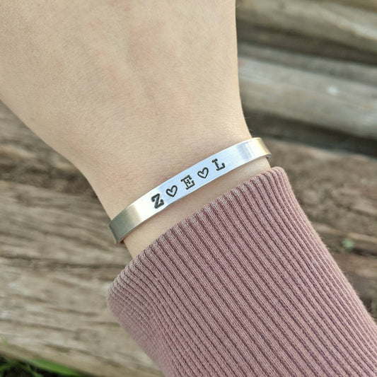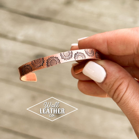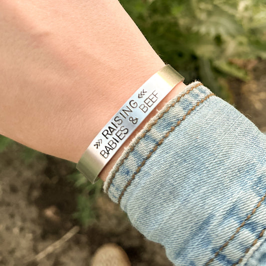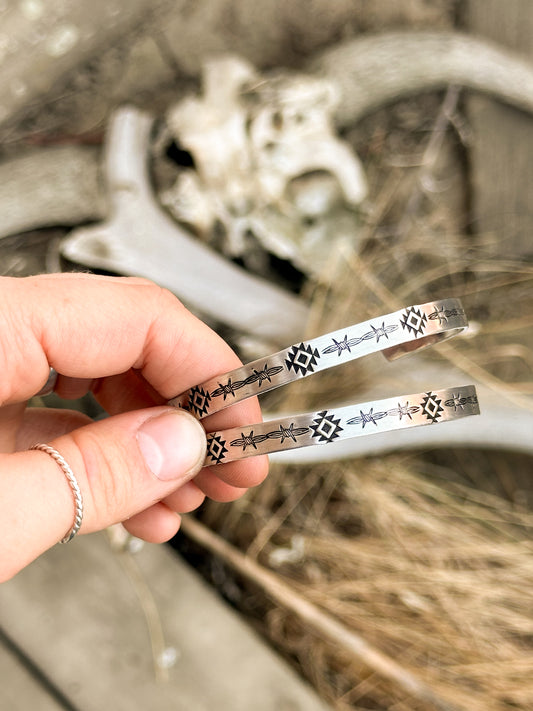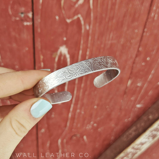 All of my hand stamped bracelets are made from aluminum, meaning that they are lightweight, won't tarnish or turn your skin green & they are safe in water. Give your wrist a little western charm!