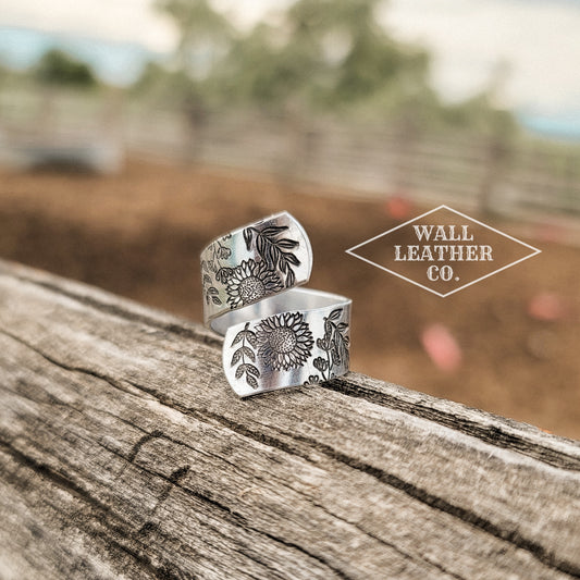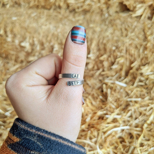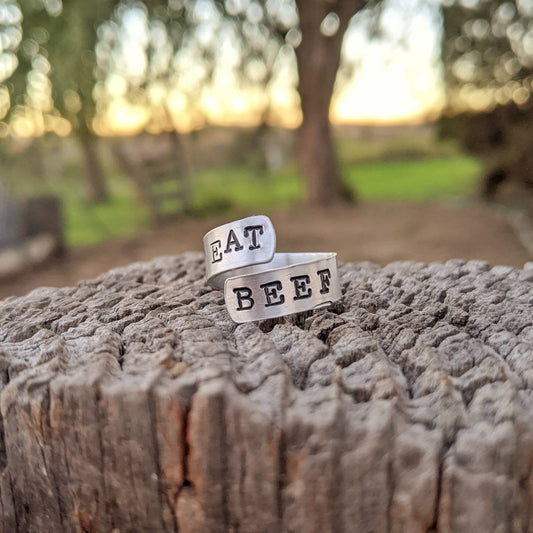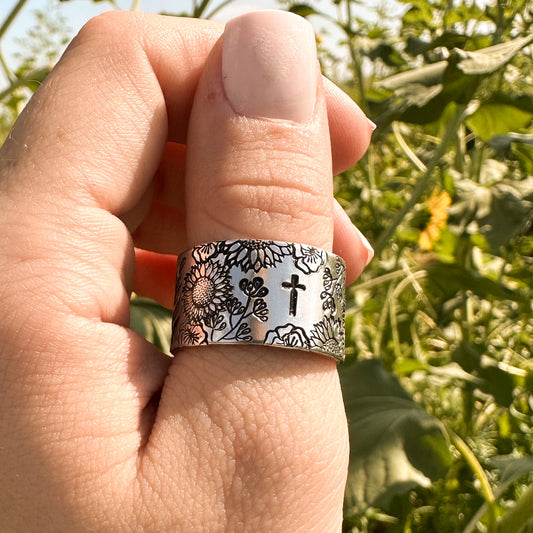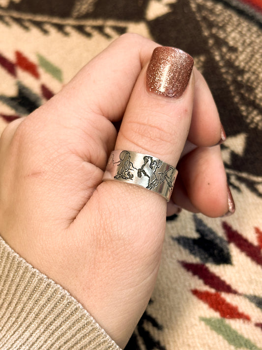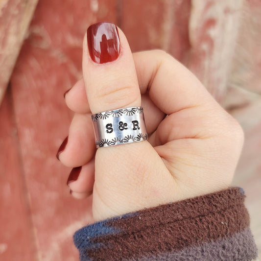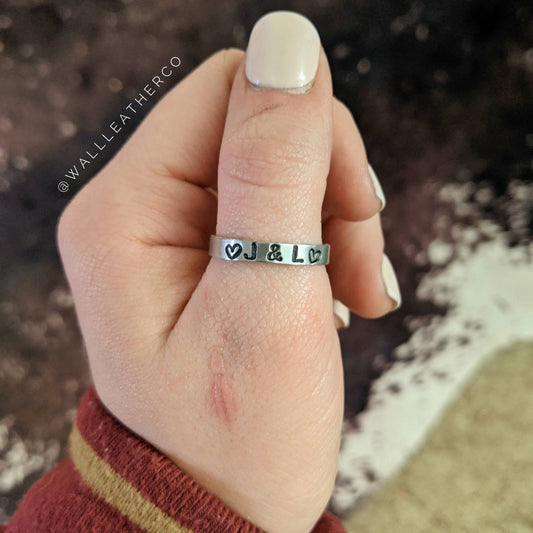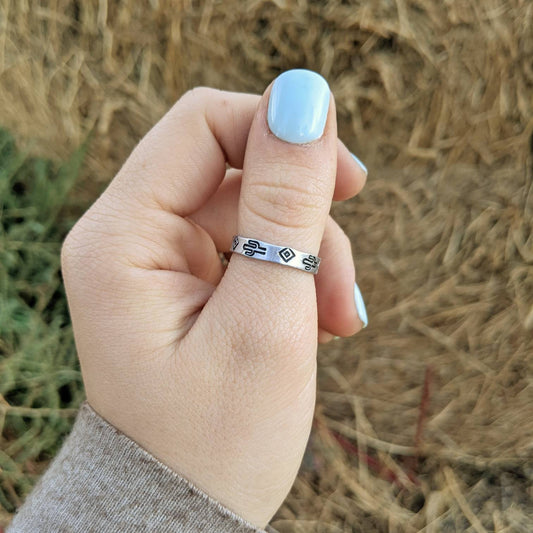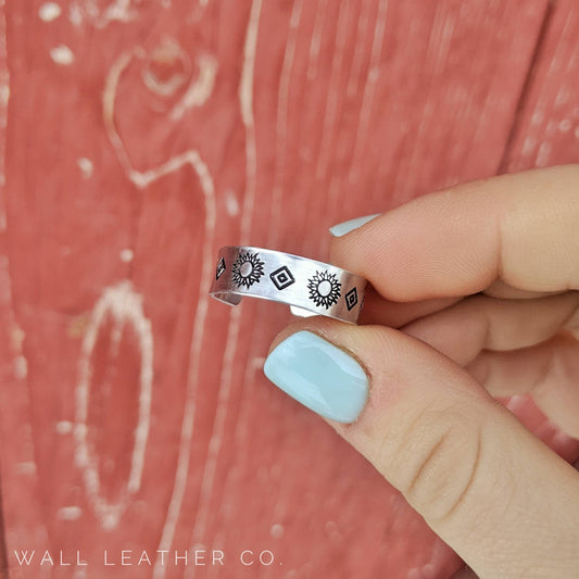 Hand stamped aluminum rings, with western style! Aluminum is such an awesome material for rings, since it won't tarnish or turn your skin green, it's lightweight & safe in water! Contact me for a custom design--if I have the stamps for it, I'll do it!