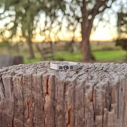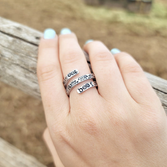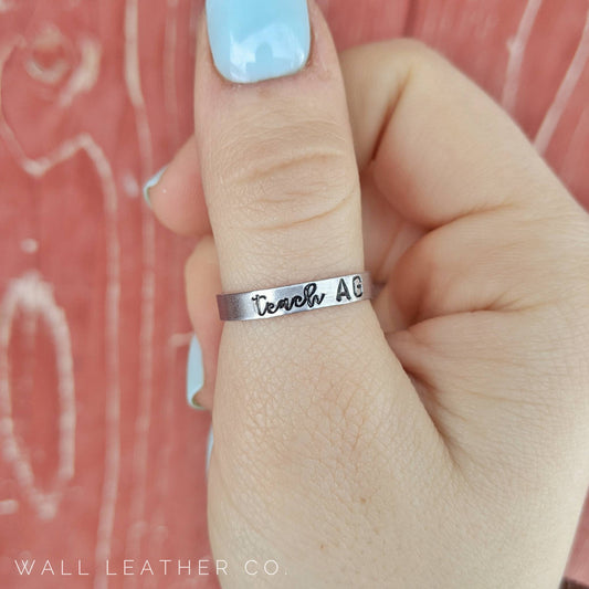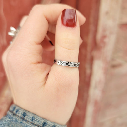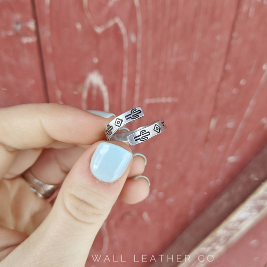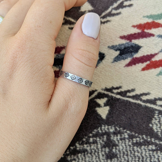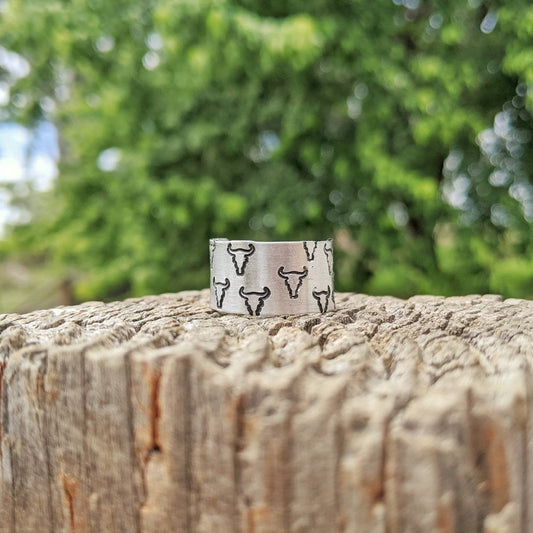 Hand stamped aluminum rings, with western style! Aluminum is such an awesome material for rings, since it won't tarnish or turn your skin green, it's lightweight & safe in water! Contact me for a custom design--if I have the stamps for it, I'll do it!