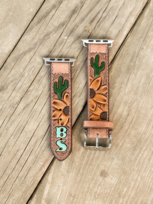Sunflower & Cactus Painted Leather Smart Watch Band w/ Initials