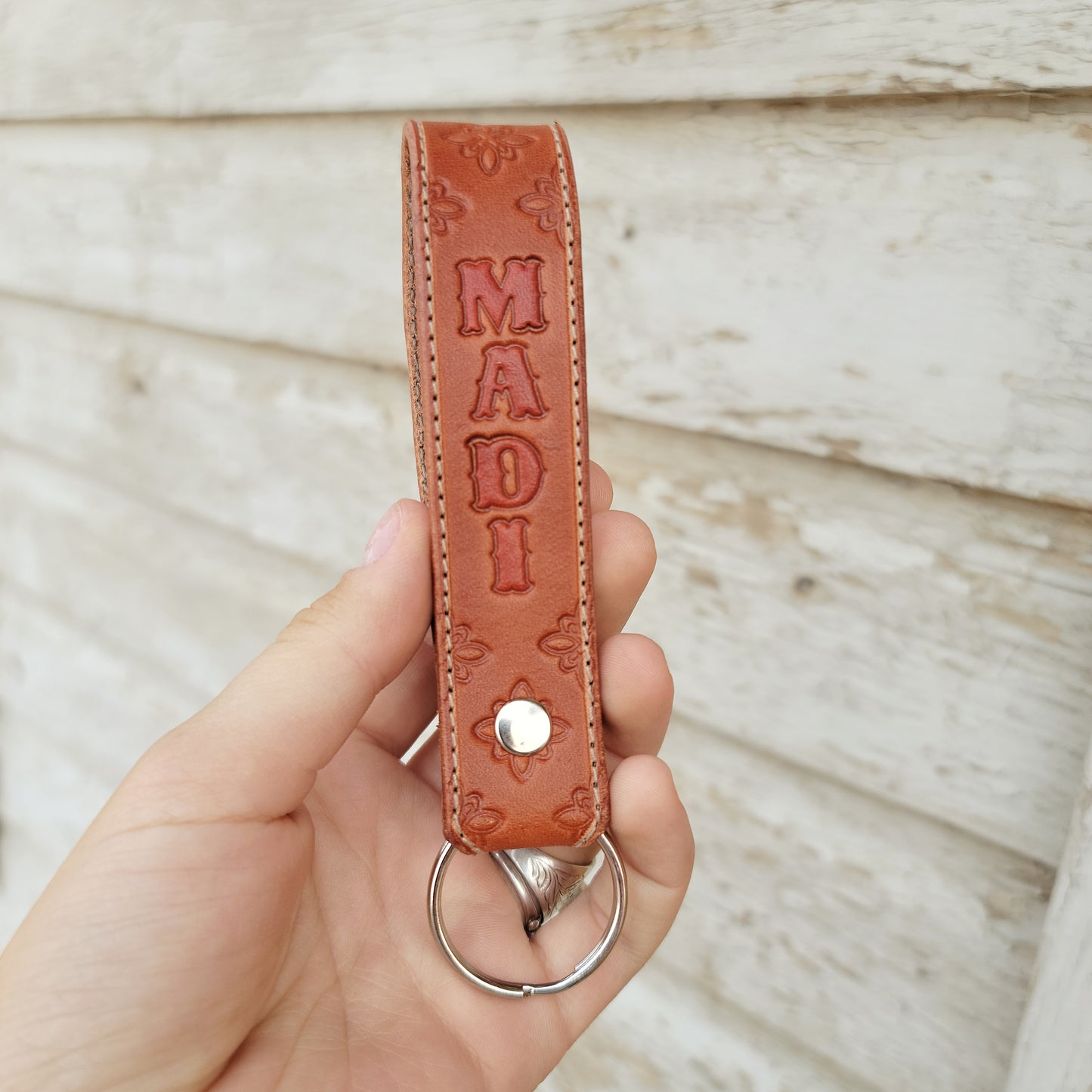 Our customizable stamped leather keychain is the perfect accessory to keep track of your keys.